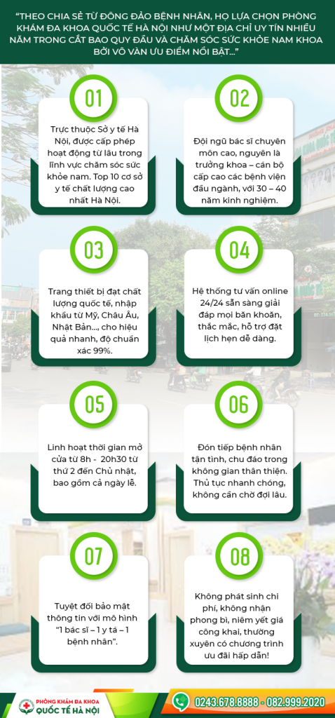 Qua nhiều năm thực hiện xứ mệnh giúp nam giới chăm sóc sức khỏe sinh sản tốt nhất, đem lại sự tự tin cho hàng ngàn anh em nam giới. Đội ngũ y bác sĩ và nhân viên Phòng khám Đa Khoa Quốc Tế Hà Nội luôn nâng cao chất lượng dịch vụ, cập nhật xu hướng thế giới và cải tiến kỹ thuật.