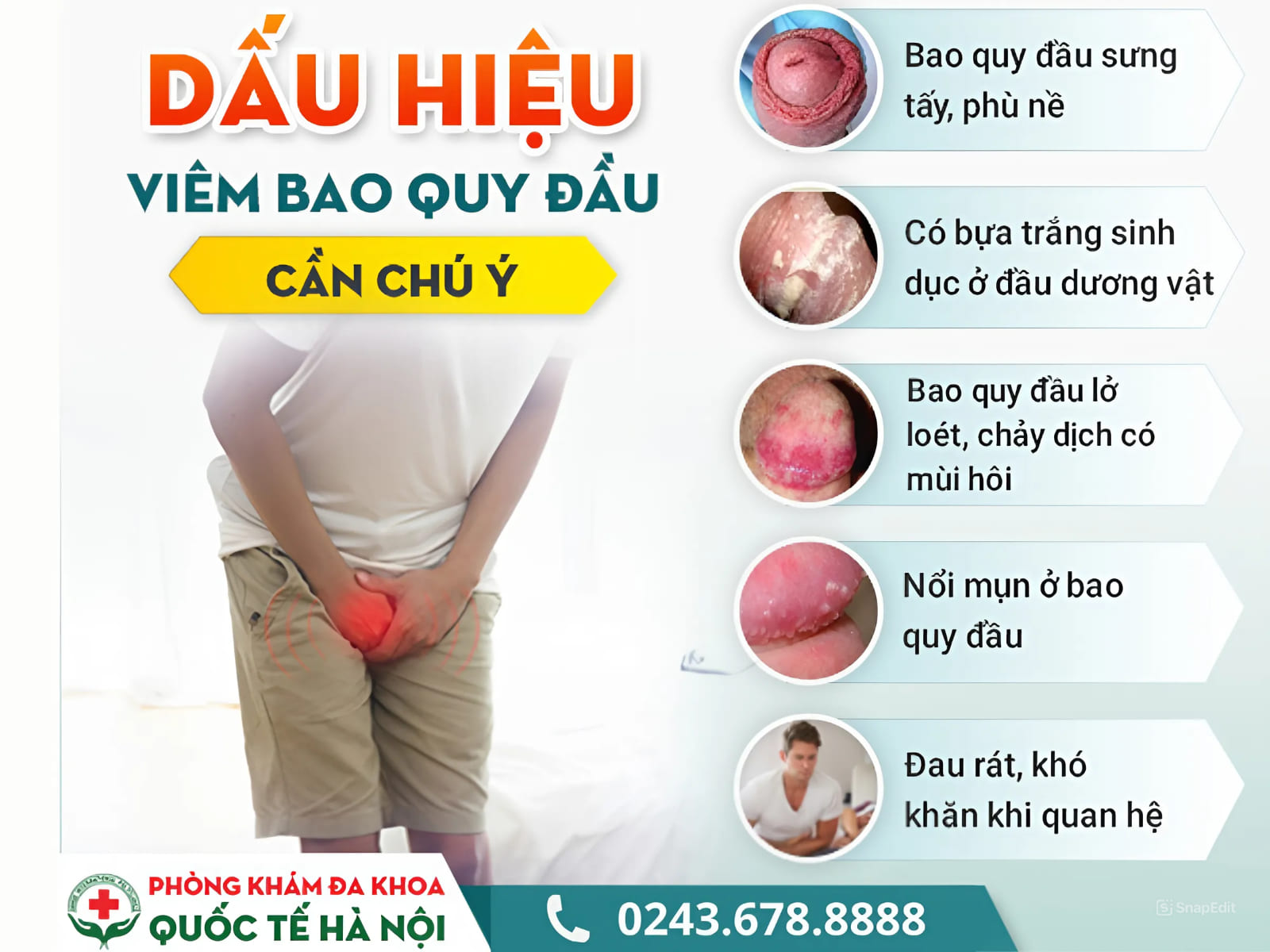 - Viêm bao quy đầu: Khi bị viêm bao quy đầu, nam giới sẽ có biểu hiện đau rát, sưng đỏ và ngứa bao quy đầu. Khi bệnh chuyển sang giai đoạn nặng, nam giới sẽ thấy bao quy đầu bị viêm loét, chảy dịch đau đớn, đau khi quan hệ, xuất tinh,…