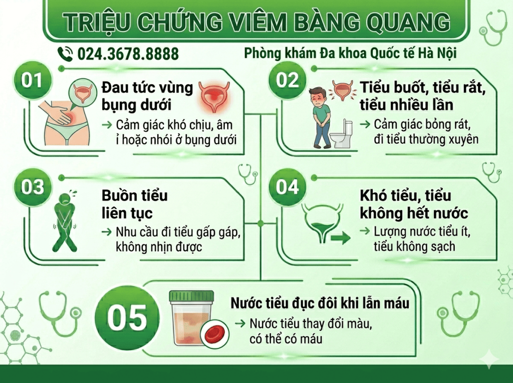 Là tình trạng viêm nhiễm tại bàng quang, thường do vi khuẩn xâm nhập từ niệu đạo. Đây là một trong những bệnh lý phổ biến nhất của đường tiết niệu dưới. Khi viêm nhiễm nặng, chức năng co bóp và tống xuất nước tiểu bị rối loạn, gây ra tình trạng: