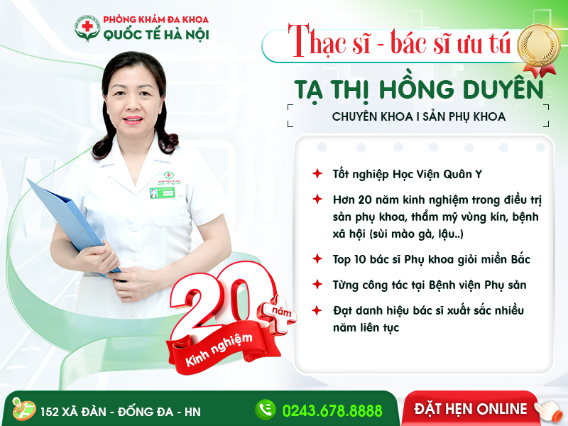Thạc sĩ – Bác sĩ Tạ Thị Hồng Duyên: Bác sĩ có hơn 30 năm kinh nghiệm khám chữa sùi mào gà. Bác sĩ từng công tác khoa Sản Phụ khoa tại Bệnh viên chuyên nghành Sản Phụ khoa của thủ đô. (Đặt lịch với bác sĩ Duyên: [TẠI ĐÂY])