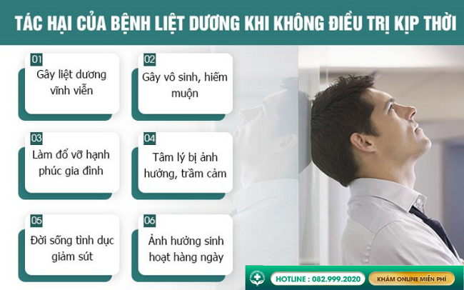 Liệt dương khiến nam giới khó khăn hơn trong quan hệ tình dục hoặc thậm chí là không thể quan hệ, gây ảnh hưởng nghiêm trọng đến khả năng sinh sản của nam giới. Nếu không điều trị kịp thời và đúng cách, bệnh kéo dài có thể gây vô sinh: