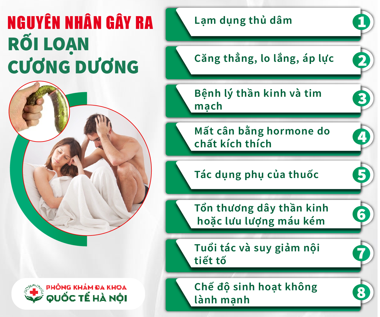 Có nhiều nguyên nhân dẫn tới tình trạng rối loạn cương dương. Có thể là do tâm lý, bệnh lý, thói quen sinh hoạt hàng ngày hoặc những chấn thương tại cơ quan sinh dục.