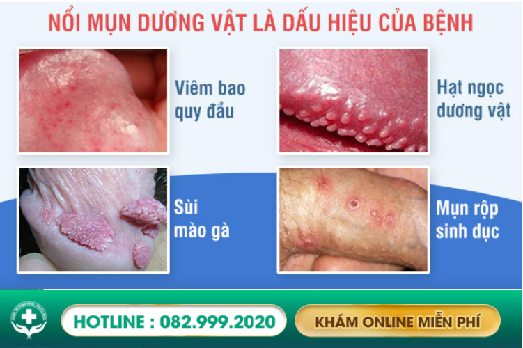 Khi thấy xuất hiện các khối u, bướu và mụn thì có thể do nam giới mắc các bệnh như: Viêm nhiễm nấm như men và nấm da, bệnh thường phát triển ở háng, bìu và ảnh hưởng tới dương vật, nhất là nam giới chưa cắt bao quy đầu, đồng thời có nhiều loại bệnh lây qua đường tình dục gây nên các triệu chứng tương tự. Nổi ban đỏ có thể là triệu chứng của các bệnh lây truyền qua đường tình dục như: lậu, giang mai,…