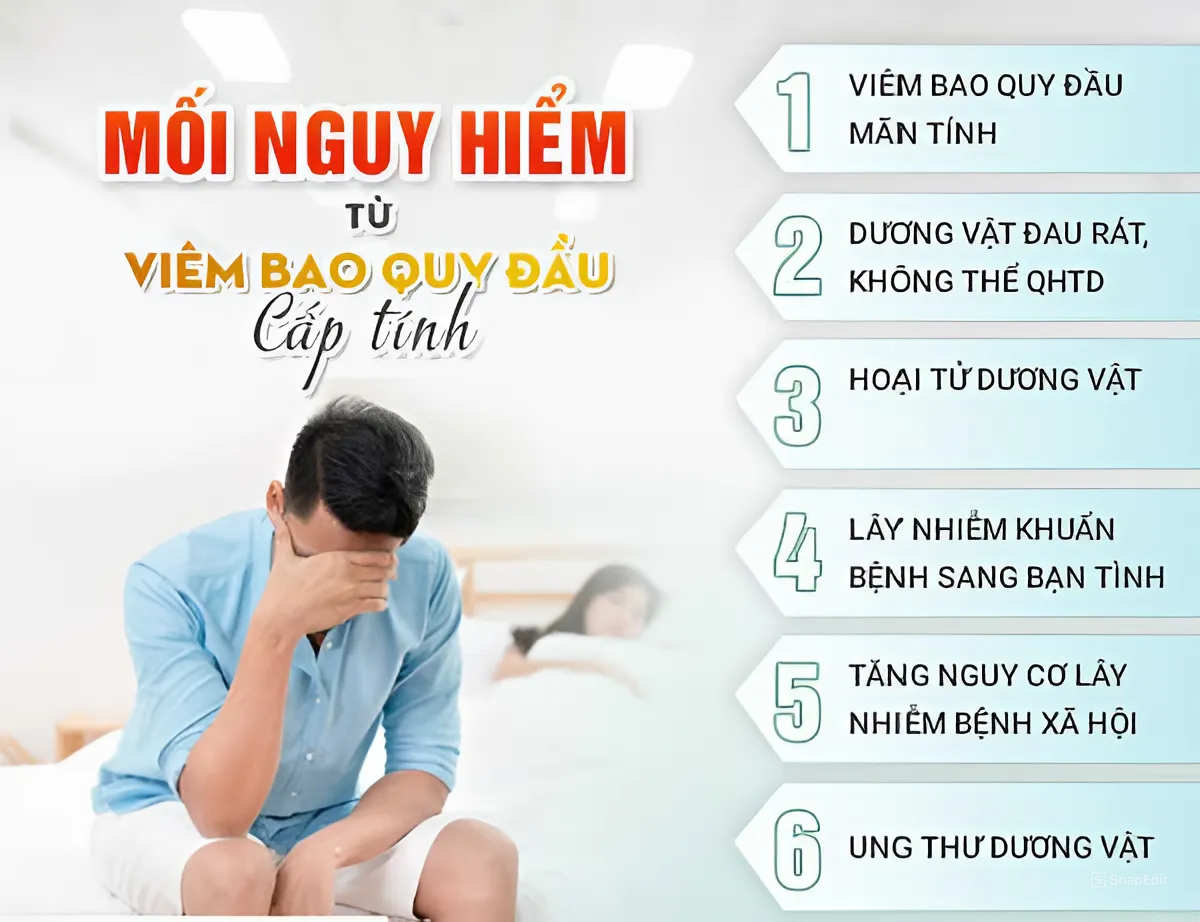 Theo Thạc sĩ Bác sĩ Lê Đỗ Nguyên CKII ngoại tiết niệu – Nam học thì viêm bao quy đầu cấp tính nếu không được điều trị kịp thời, đúng cách có thể tái phát nhiều lần, chuyển sang giai đoạn mãn tính, khiến cho việc điều trị cũng trở nên khó khăn hơn. Nghiêm trọng hơn, ở giai đoạn mãn tính nếu như không được xử lý tốt bệnh sẽ ảnh hưởng đến khả năng sinh sản cũng như sinh hoạt hàng ngày của người bệnh. Vì thế, anh em nam giới cần nắm bắt được dấu hiệu của bệnh để thăm khám và điều trị sớm.